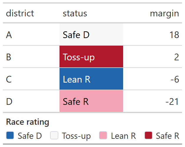 status = c('Safe D', 'Toss-up', 'Lean R', 'Safe R'),