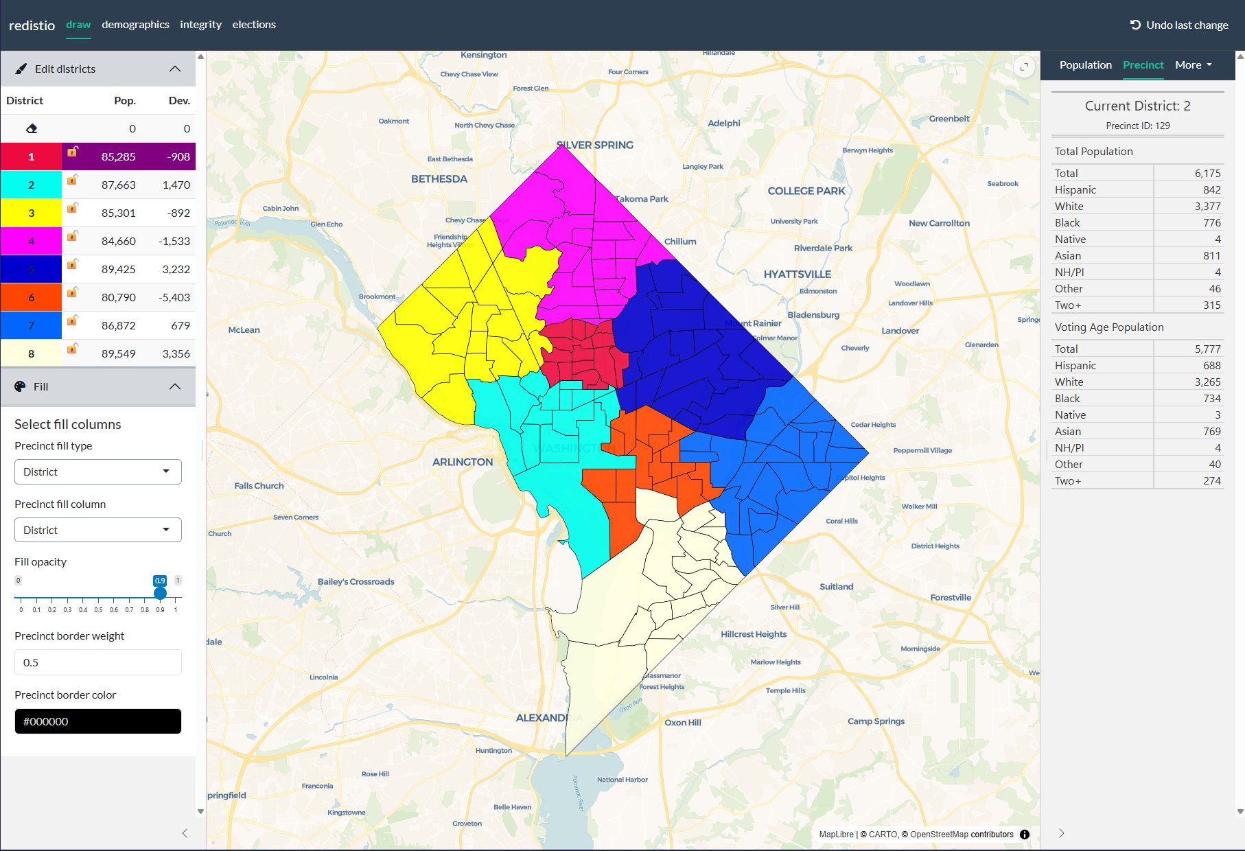 The most basic application of redistio starts with an sf tibble and a column of district assignments.